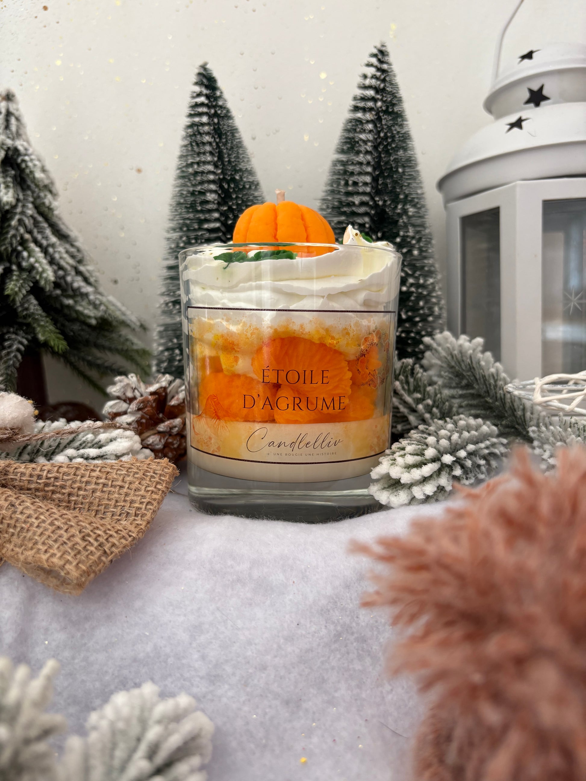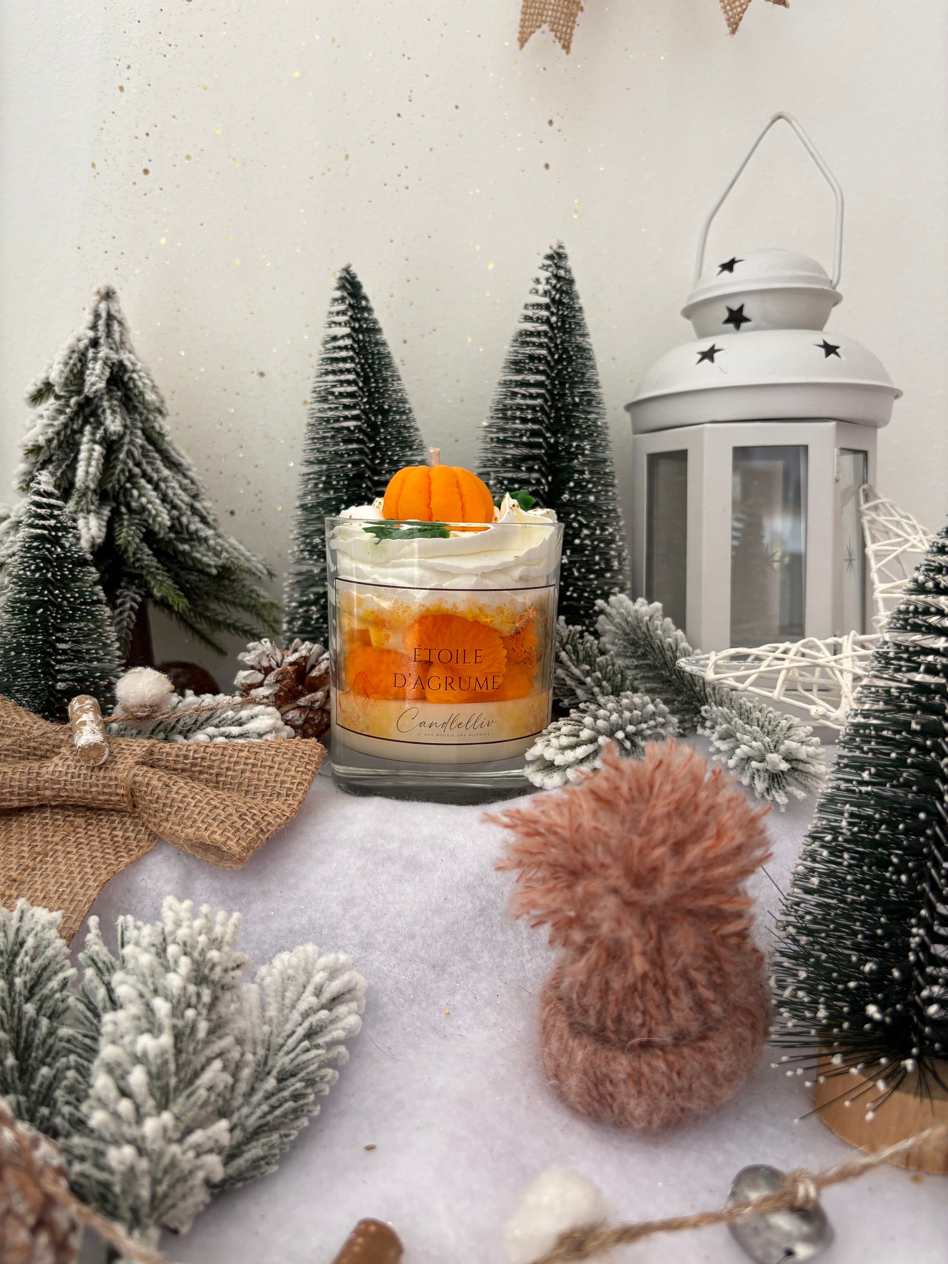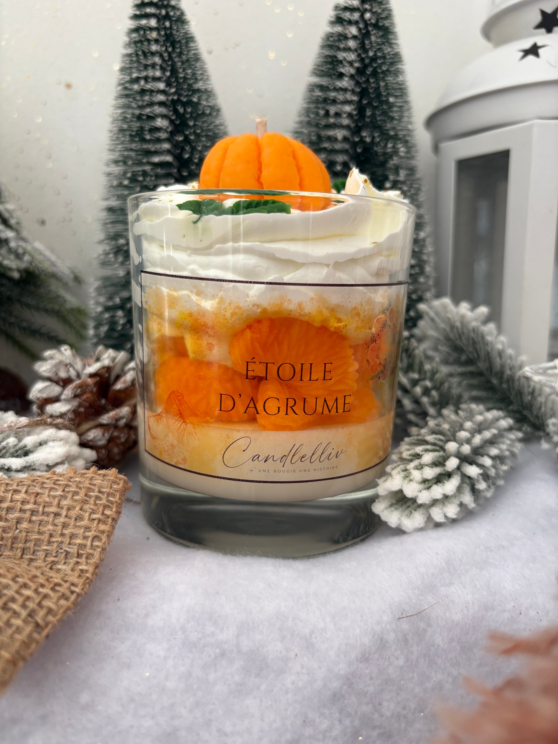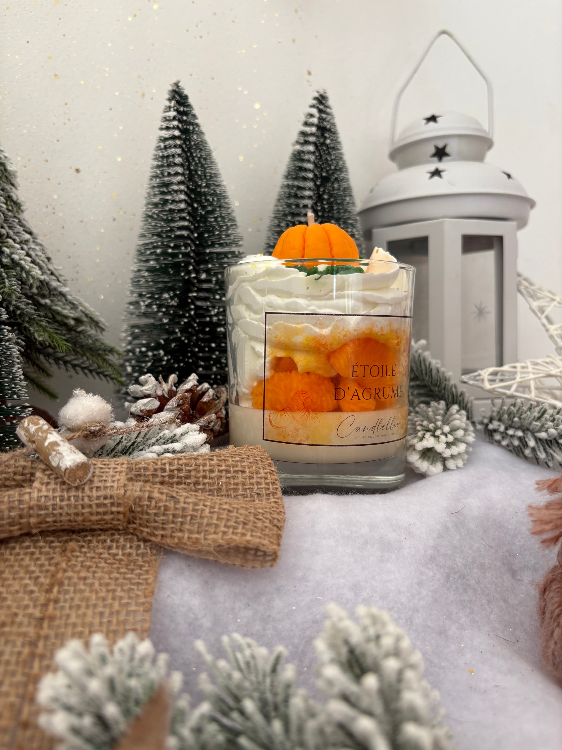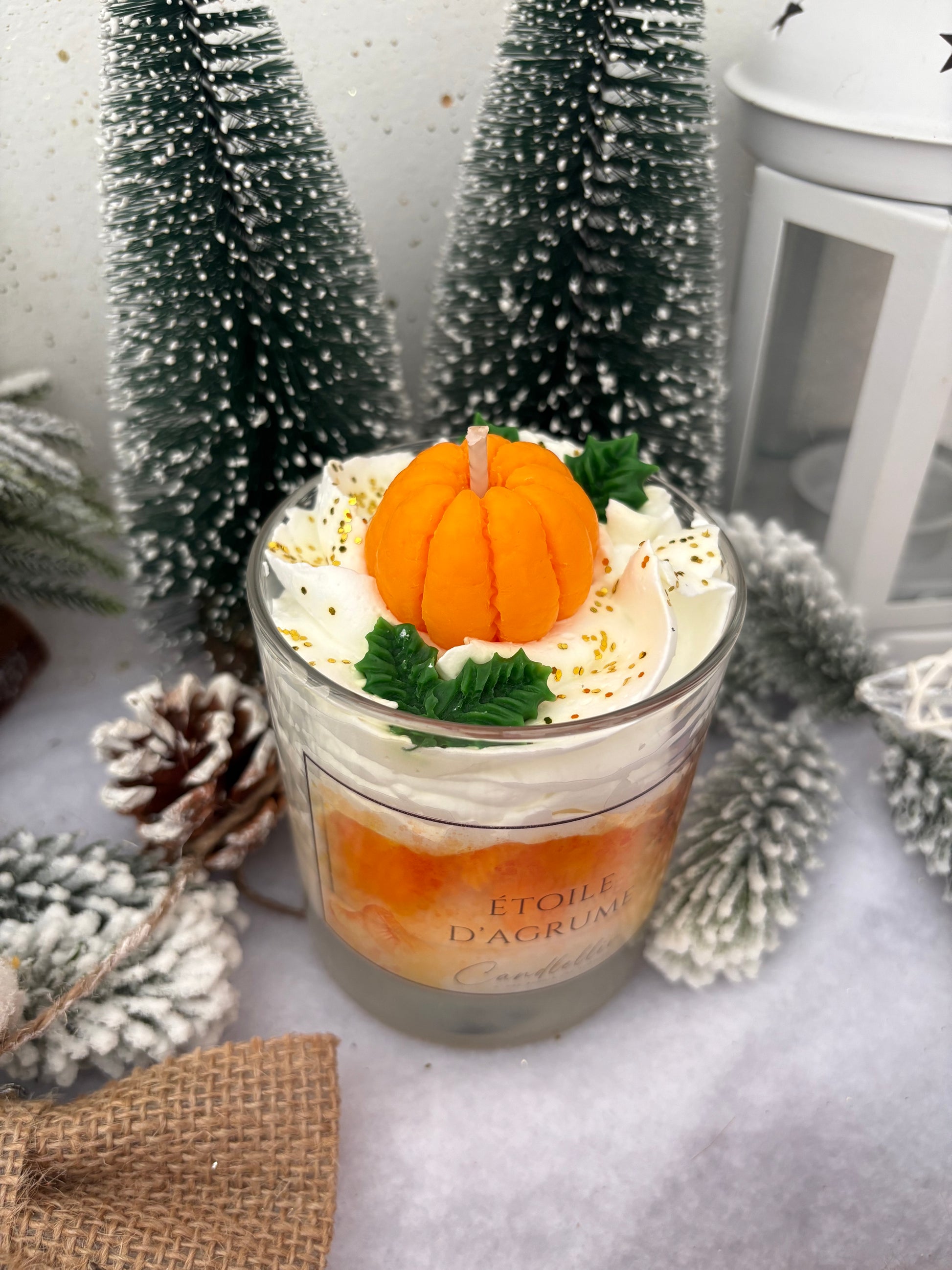 La bougie « Étoile d'Agrume » s'habille d'une cire beige lumineuse parsemée de paillettes dorées, évoquant la douceur des lumières de fête et le velouté d'un matin d'hiver. Une chantilly beige pailletée surmonte le tout, et trône au sommet une mandarine en cire, symbole de gourmandise et d'éclat festif — comme un rayon de soleil orangé au cœur des célébrations.