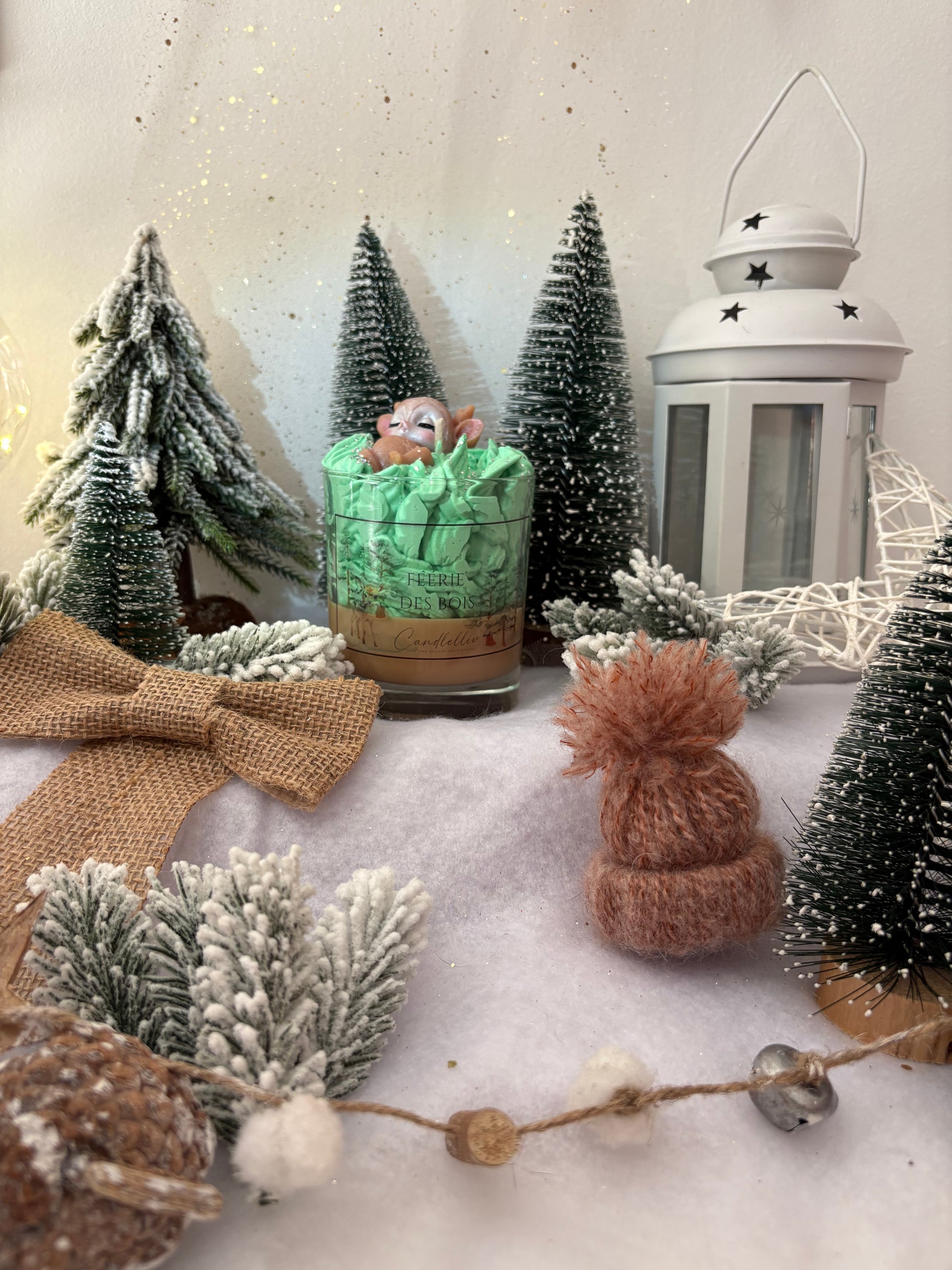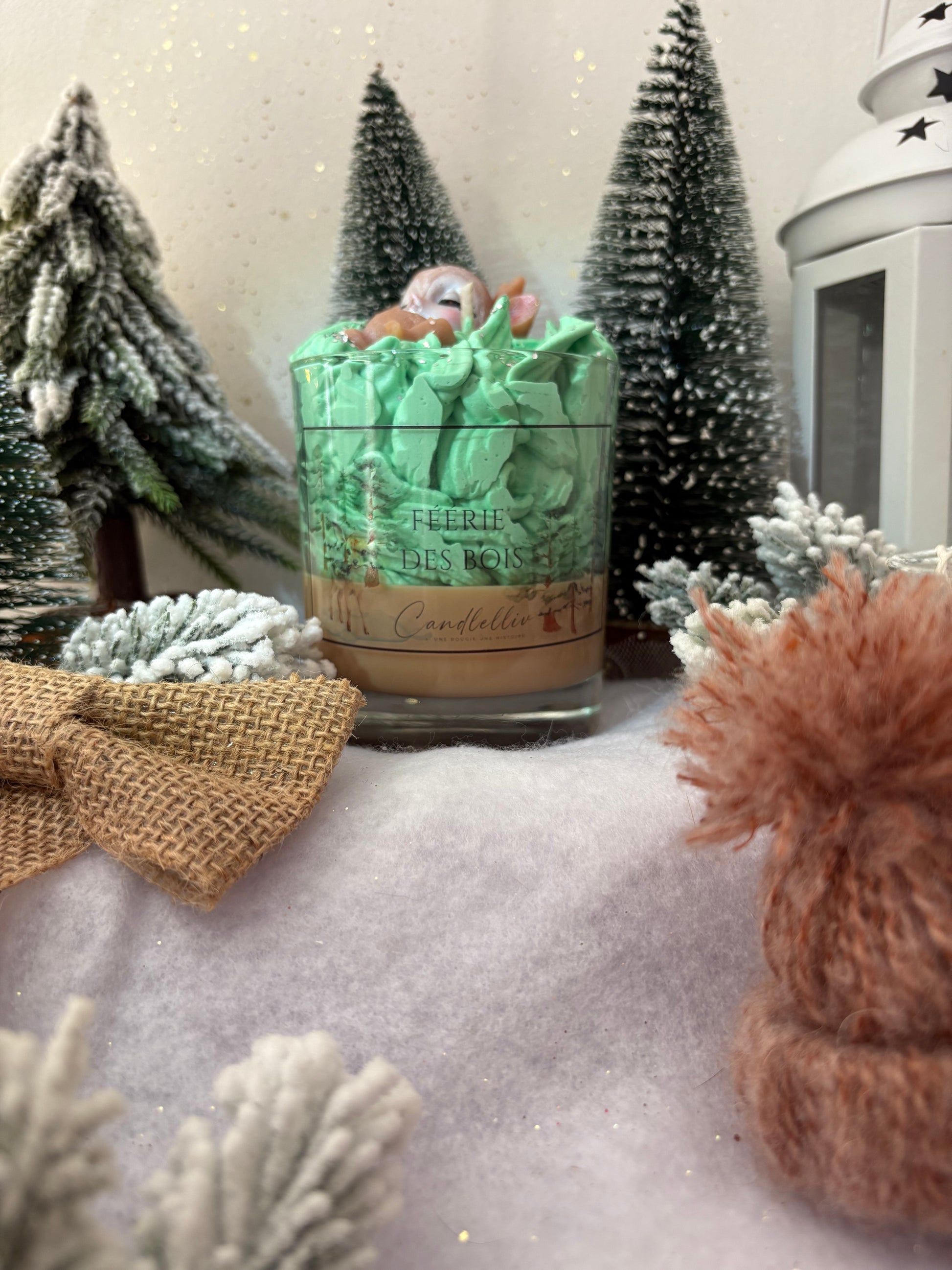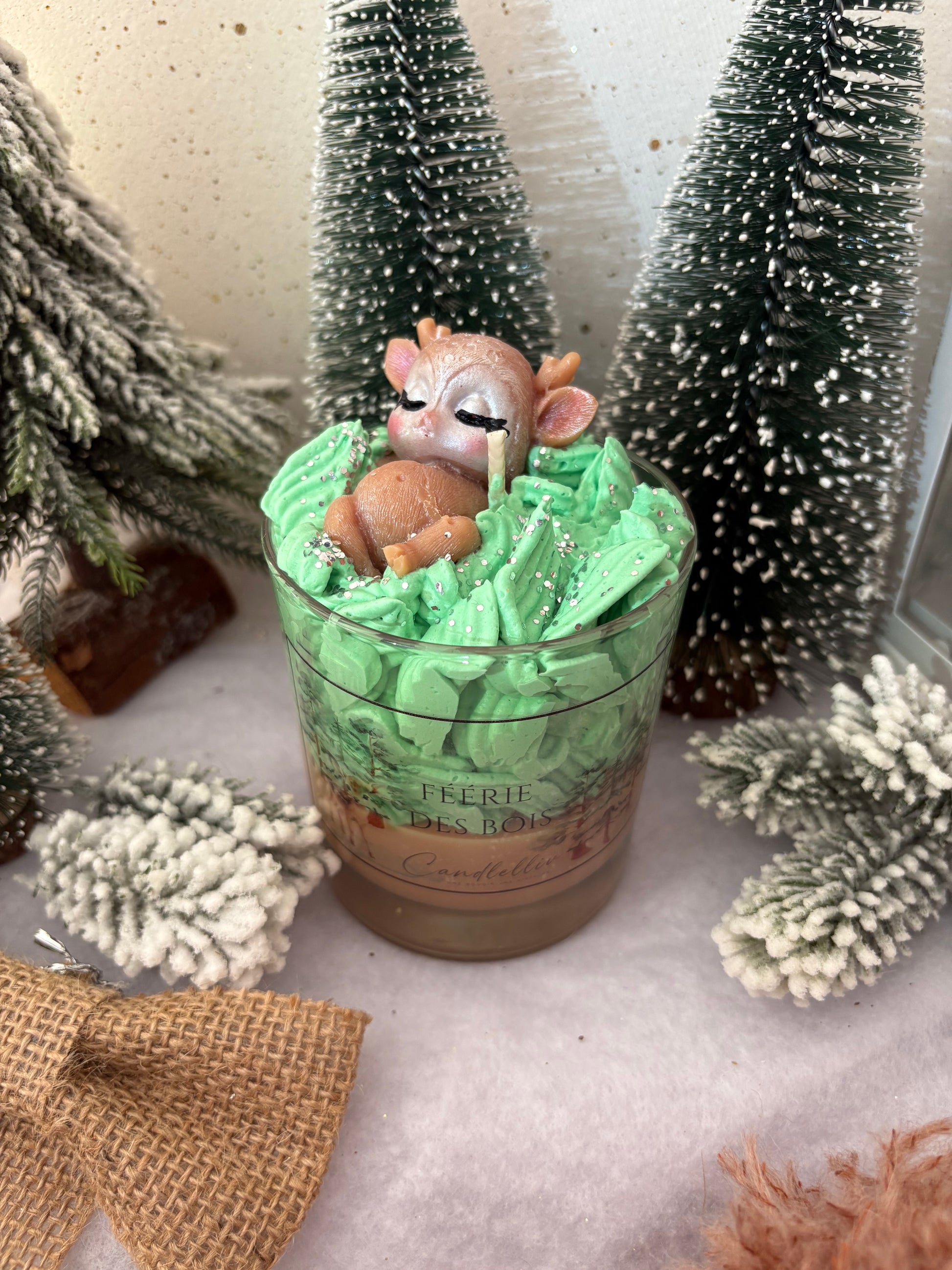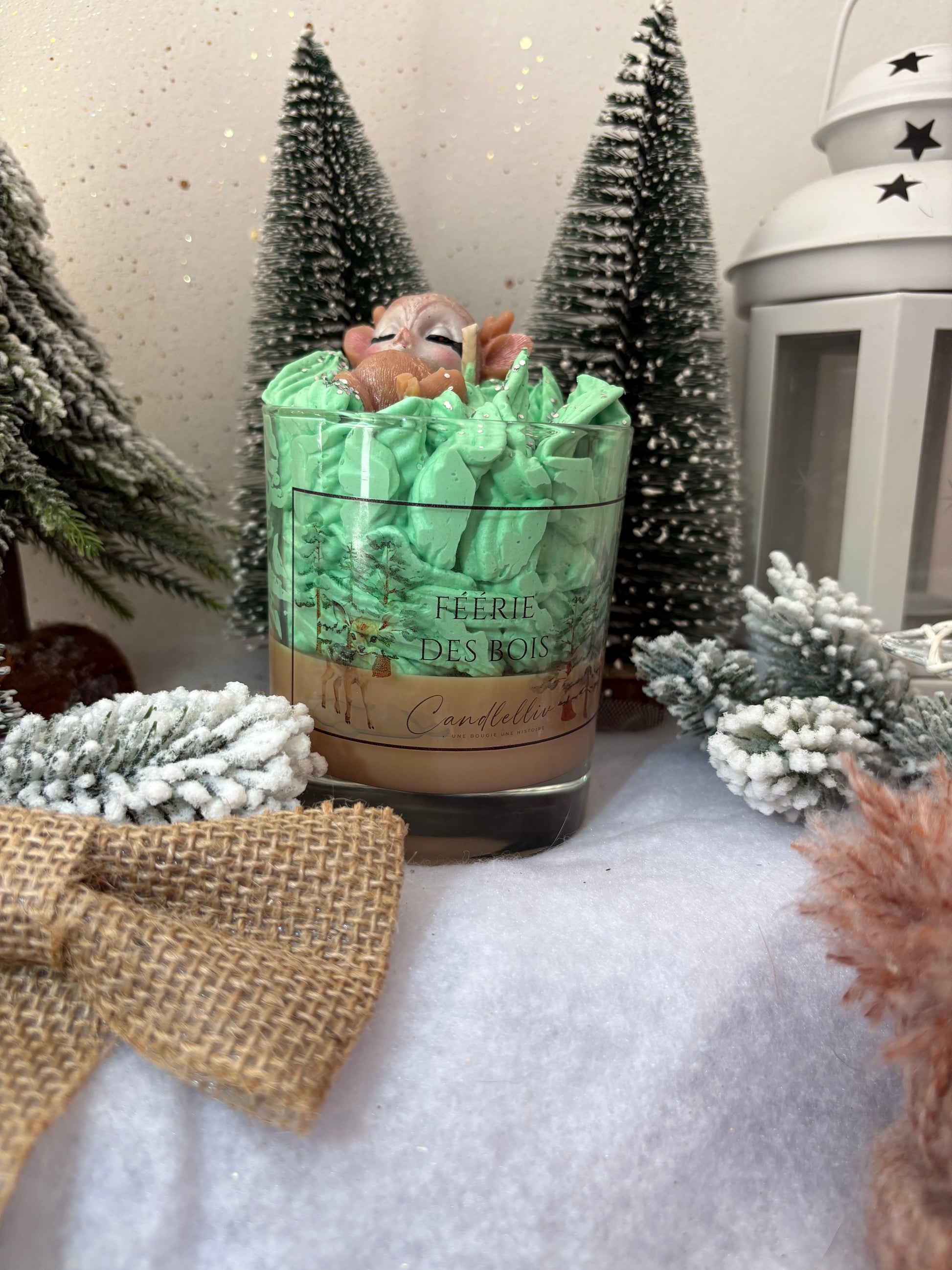 La bougie « Féerie des Bois » évoque la quiétude d’une clairière au cœur de l’hiver : sa cire de fond adopte un marron profond rappelant le bois, traversée parfois par des reflets subtils de givre. Une chantilly verte s’élève, rappelant les cimes des sapins dans les premières lueurs du matin. Au centre, un petit faon en cire dort paisiblement, figé dans un instant magique, entouré d’un décor végétal minutieux – murmure de forêt, silence enveloppant.
