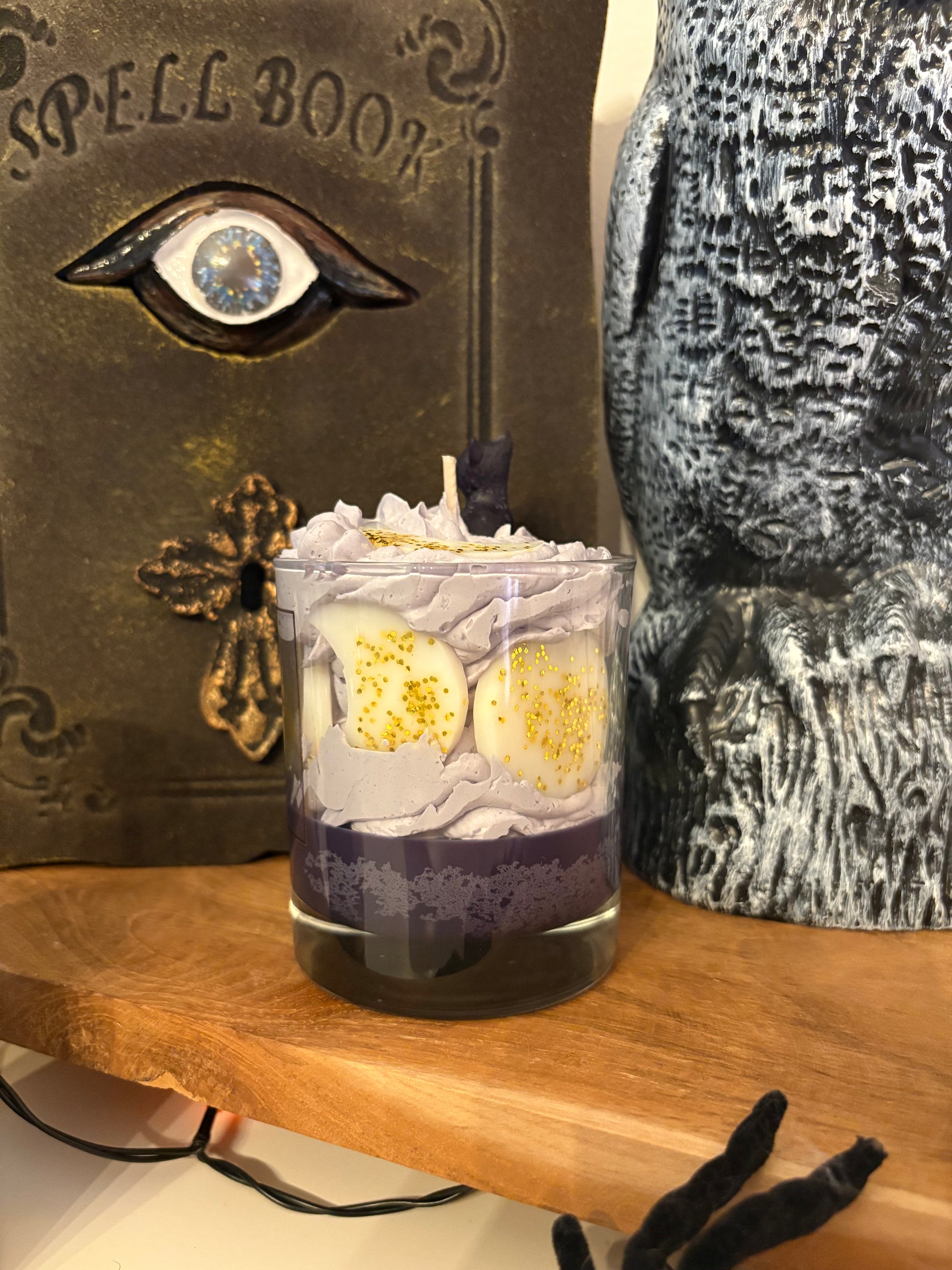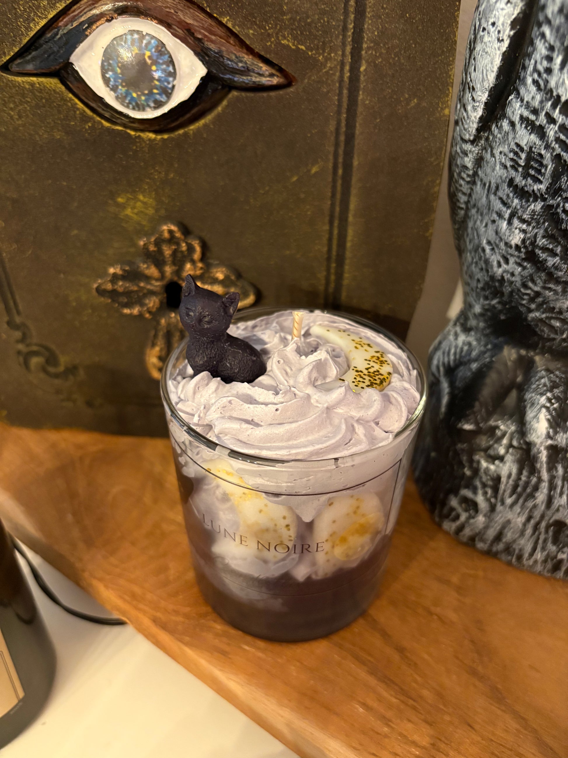 La bougie « Lune Noire » déploie une base de cire noir profond, intense comme une nuit sans lune. Sur cette surface, une chantilly grise onctueuse vient délicatement s’élever, apportant un contraste doux et nuancé. Au sommet, un chat noir en cire, élégant et silencieux, veille sous un croissant de lune et les phases lunaires sculptées en cire, symboles d’un cycle secret et hors du temps. Le tout compose une pièce décorative à la fois raffinée, mystérieuse et empreinte de charme.