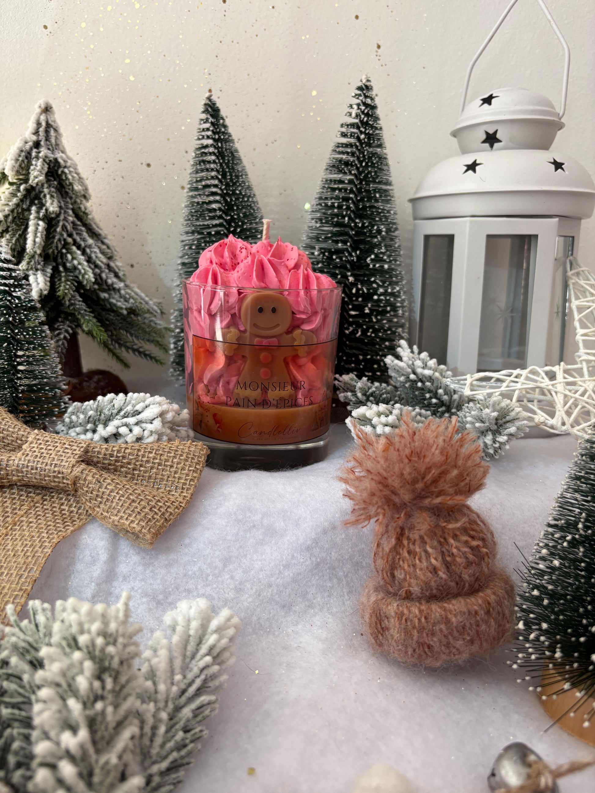 La bougie « Monsieur Pain d’Épices » s’habille d’une base marron riche, évoquant la pâte parfumée encore tiède du biscuit de fête, et se coiffe d’une chantilly rouge éclatante qui rappelle les rubans et l’esprit de Noël. Le tout est saupoudré de paillettes rouges scintillantes. Y trône un joli monsieur en pain d’épices en cire, comme s’il venait de sortir du four pour égayer vos instants cocooning.