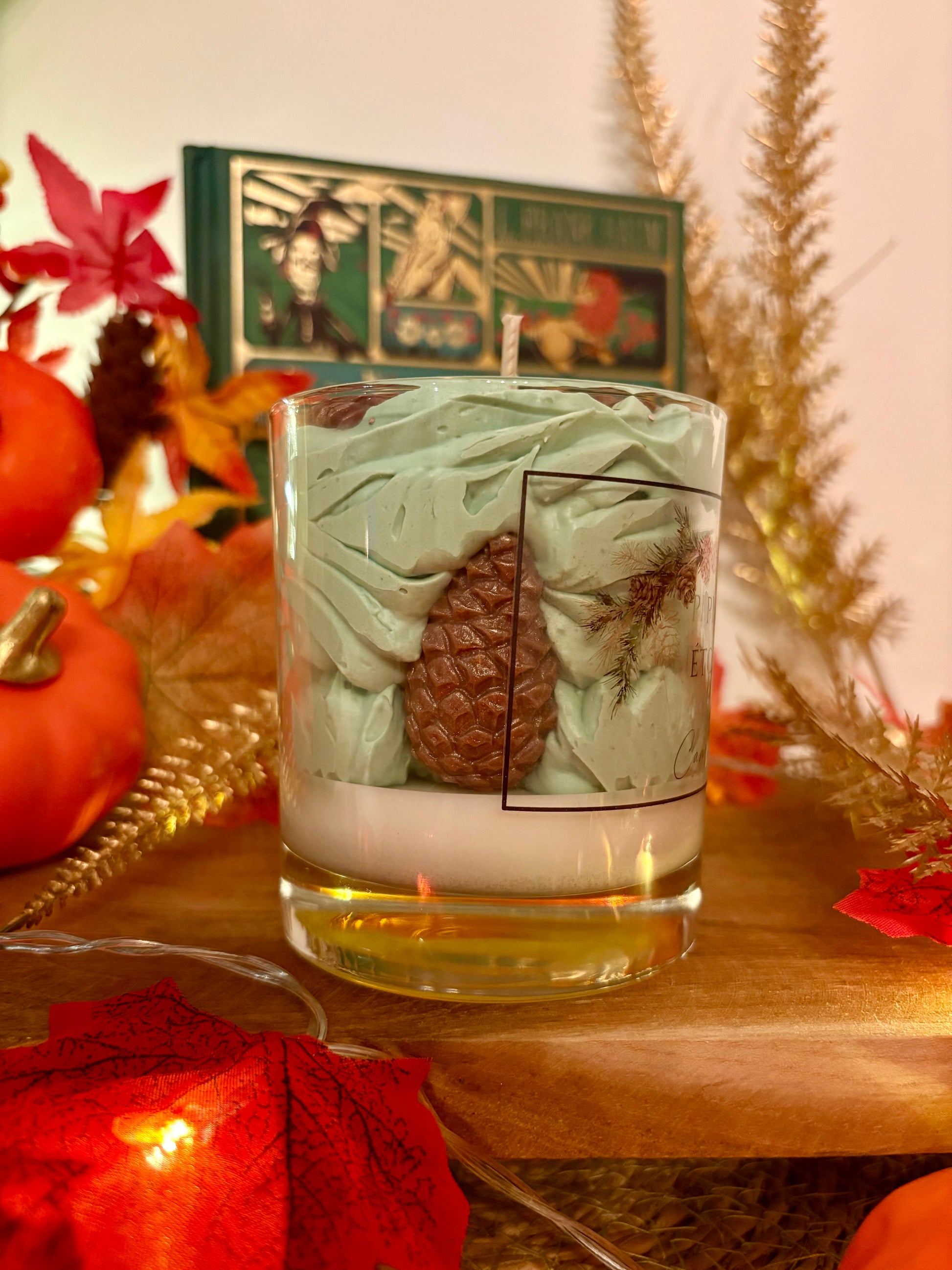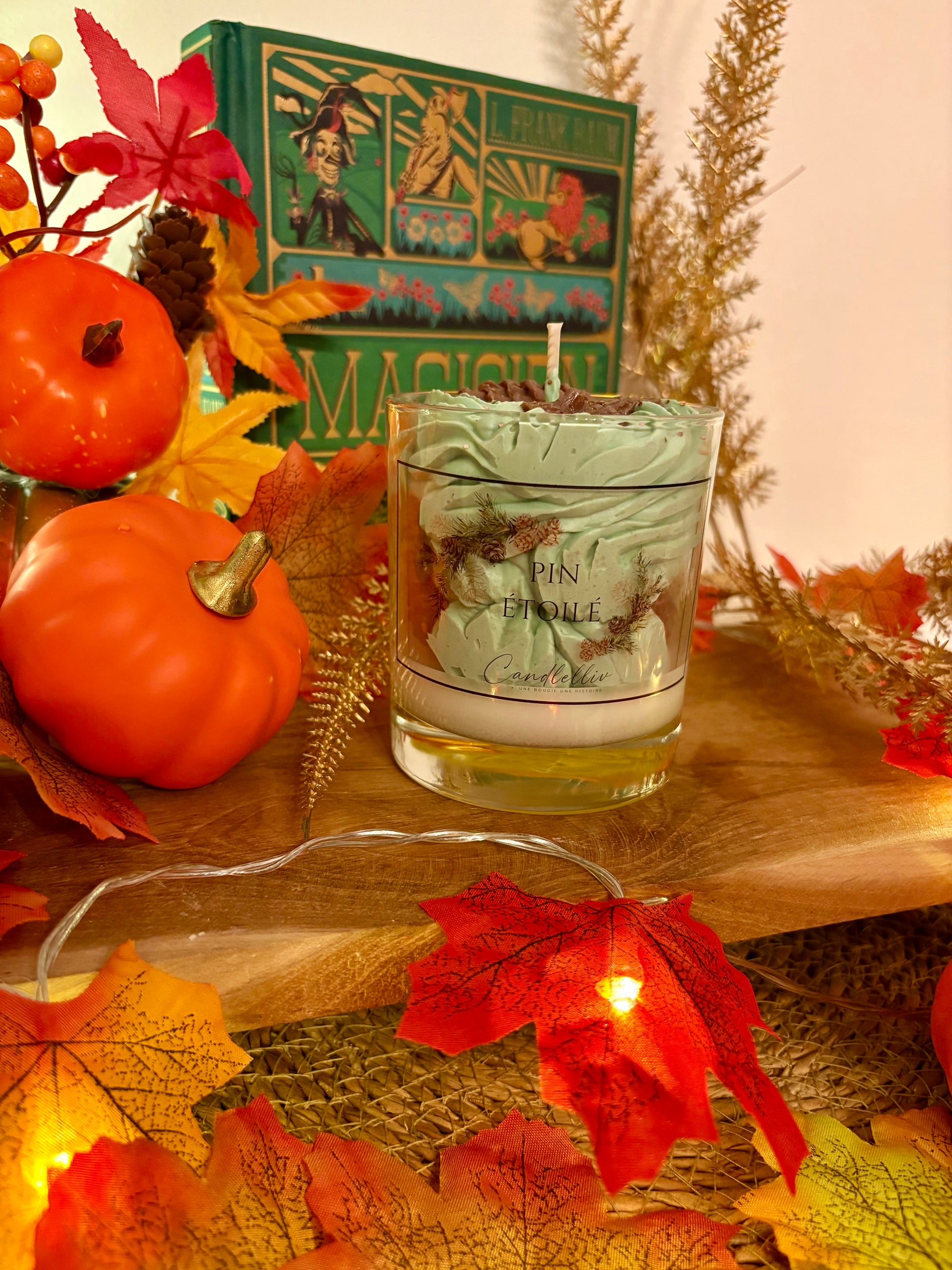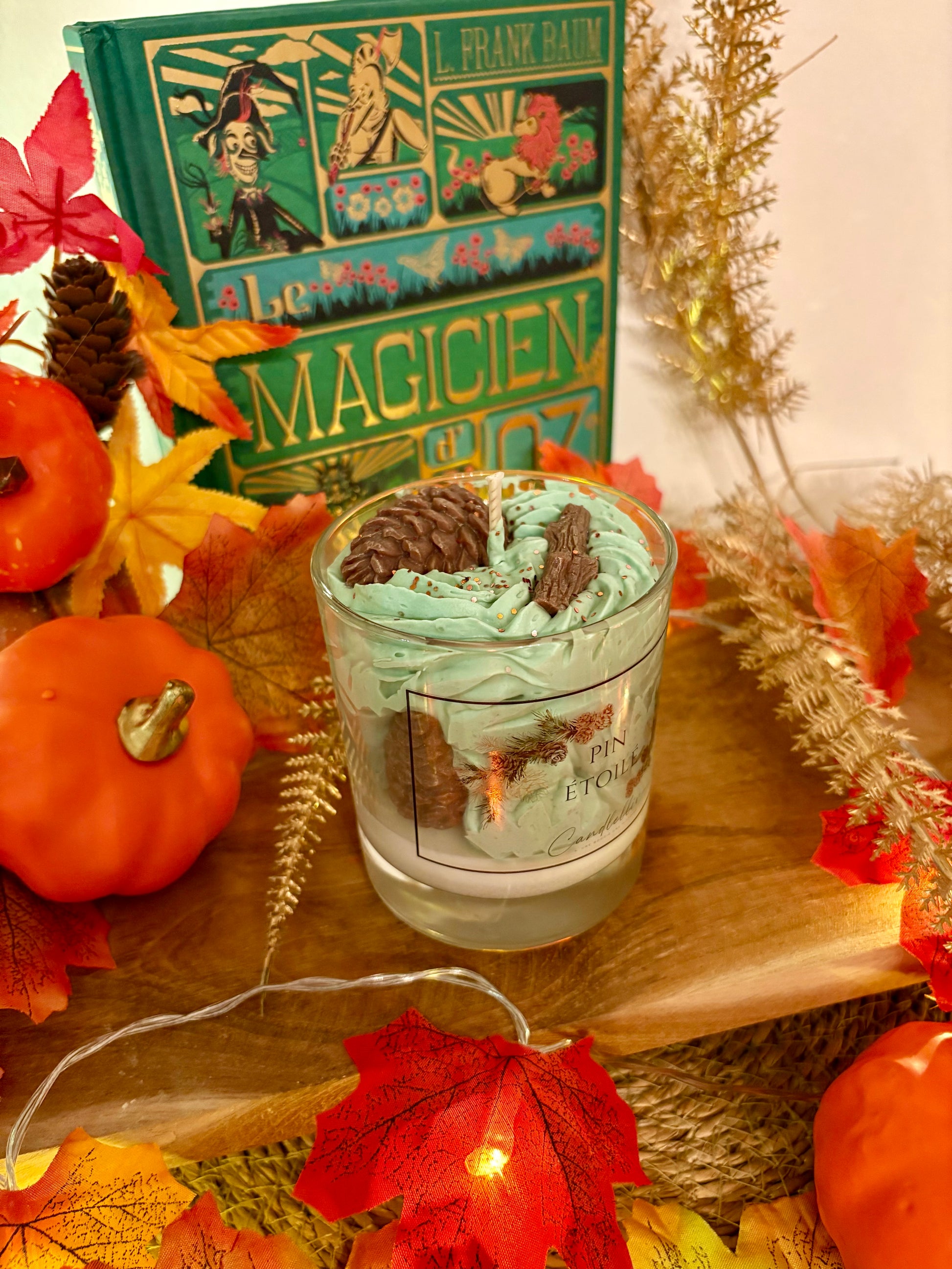 « Pin étoilé » capture la beauté paisible d’une forêt sous les étoiles. Sa chantilly de cire verte, douce et mousseuse, évoque les aiguilles de pin illuminées par la lueur d’une flamme. Sur le dessus, de petites pommes de pin, des morceaux d’écorce naturelle et de délicates paillettes cuivrées viennent compléter le décor, apportant une touche féérique et chaleureuse.Une création raffinée et harmonieuse, où la nature rencontre la lumière — parfaite pour les soirées cocooning et les ambiances d’automne.