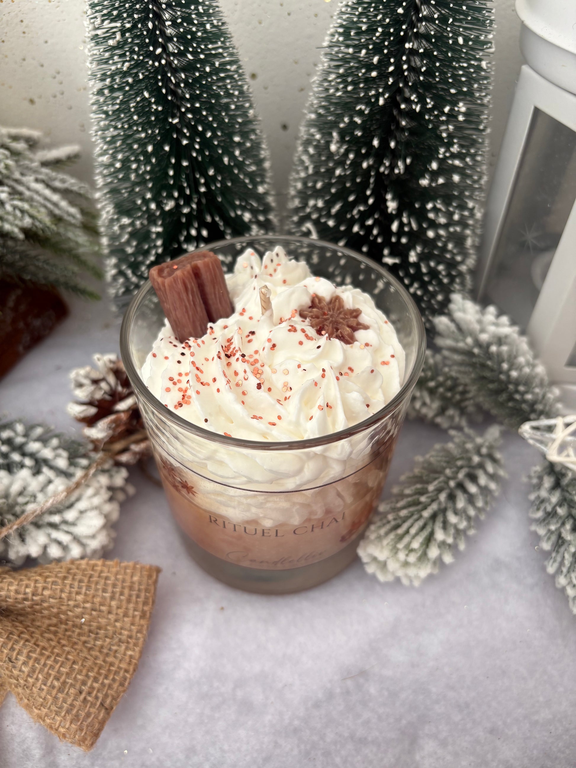 La bougie « Rituel Chai » évoque une pause chaleureuse, enveloppée dans une ambiance veloutée : une base de cire marron chocolatée évoquant un mug fumant de chai latte, surmontée d’une chantilly blanche aérienne qui capte la douceur du lait chaud. Au sommet, un bâton de cannelle sculpté en cire et une étoile d’anis viennent parfaire le décor gourmand — un clin d’œil visuel aux épices emblématiques du chai.